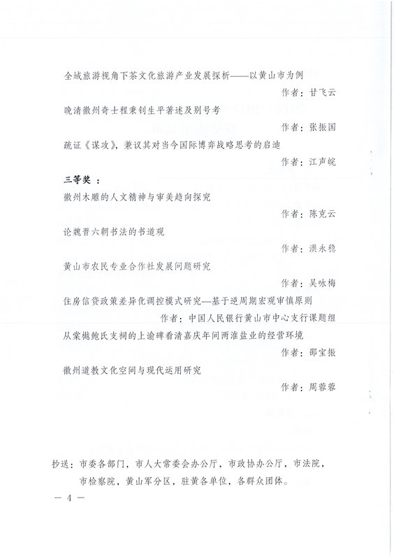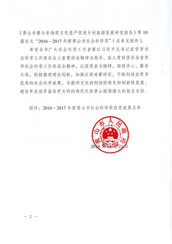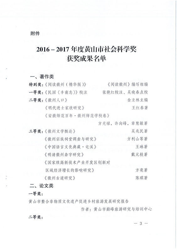 关于表彰2016-2017年度黄山市社会科学奖获奖成果的决定
