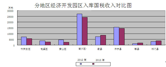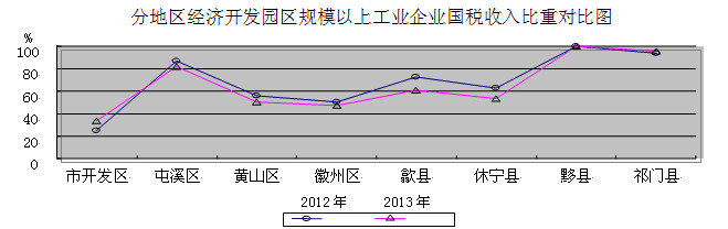 黄山市园区包括:省政府批准设立的省级歙县经济开发区;省政府批准筹建的黄山经济开发区、休宁经济开发区、祁门经济开发区、黟县经济开发区、黄山工业园区、徽州经济开发区、歙县北岸经济开发区等7个省级开发区;市政府批准设立的市级屯溪经济开发区。9个园区规划总面积88.1平方公里,目前已建成面积41.5平方公里。截至2013年底,全市园区累计招商签约项目1028个,其中工业项目840个;累计完成固定资产投资672亿元,其中基础设施投入147亿元;国税登记企业1077户,占全市国税企业户数的12.7%。2013年度实现园区总产值512亿元、工业总产值484.7亿元、工业增加值112.5亿元,较上年分别增长19.3%、21%、19%;入库国税收入6.33亿元,占全市国税总收入的29.2%,其中规模以上工业企业入库国税收入3.51亿元,占全市国税总收入的16.2%。