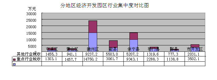 (二)产业特色不够鲜明。园区能够有效推进产业集群的发展,产生“规模效应”和“乘数效应”,进而推动经济结构的调整和优化。黄山市园区近年来在发展主导产业上取得了一定成效,其中徽州区园区的印刷和记录媒介复制业、化工行业的产业集群效应初步显现,2013年两个行业提供了徽州区园区54.2%的国税收入,其他园区产业特色较为模糊,产业链条发展不够完善,重点行业对区域经济增长的辐射和带动作用不强。另外,商贸企业比重偏高,2013年园区入库国税收入前30名中有6户商贸企业,商贸企业纳税不稳定,一定程度上也增加了税收执法风险。