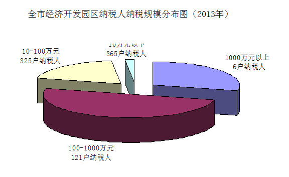 4.税源规模梯次分布。从2013年园区税源结构看,园区税源规模梯次分布,后续发展空间广阔。入库税款1000万元以上的有6户,合计入库税款1.84亿元,占全市园区总税收的29.1%,其中黄山永新股份入库税款7857万元,休宁久泰入库税款3918万元,昌辉汽车入库税款2135万元,分别位居前三位;入库税款100-1000万元的有121户,合计入库税款3.24亿元,占全市园区总税收的51.1%;入库税款10-100万元的有325户,合计入库税款1.22亿元,占全市园区总税收的19.2%。另有260户纳税人(主要是近期招商入园企业)未缴纳税收。