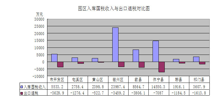 5.出口退税比重高。从2013年园区出口退(免)税情况看,全市园区办理出口退(免)税2.26亿元,占全市出口退(免)税总量的68.9%,其中办理出口退税1.61亿元,占全市出口退税总量的62%,办理免抵调库6458万元,占全市免抵调库的95.1%。从园区出口退(免)税与园区入库国税收入之比来看,除徽州区、黄山区接近全市平均水平之外,其余园区均大幅度超过全市平均水平,其中市开发区办理出口退(免)税3629万元,与入库国税收入之比为65.6%,位居首位。