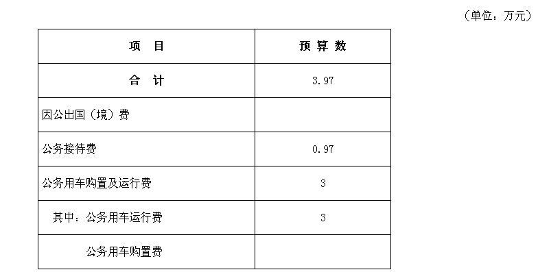 2015年,为全面反映“三公”经费支出,本次公布的“三公”经费预算为部门汇总数,包含局本级和局属单位。2015年,“三公”经费财政拨款预算数为3.27万元,其中:因公出国(境)费零万元,公务接待费0.97万元,公务用车购置及运行费3万元。具体情况如下: